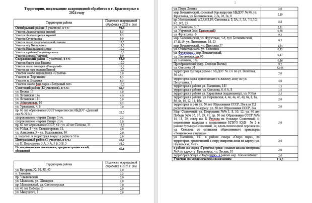 Как и в прошлом году, обработают более 460 гектаров земли, посмотреть список всех участков можно ниже на картинке. Эти территории выбрали специалисты краевого Роспотребнадзора. Все земли прилегают к природному ландшафту, либо находятся в спальных районах, где членистоногие особенно активны.