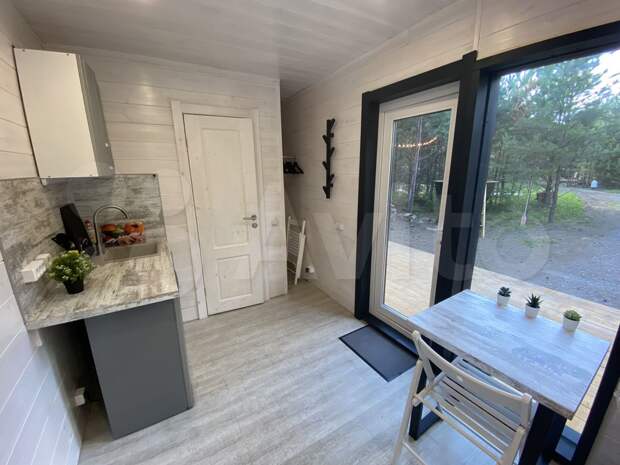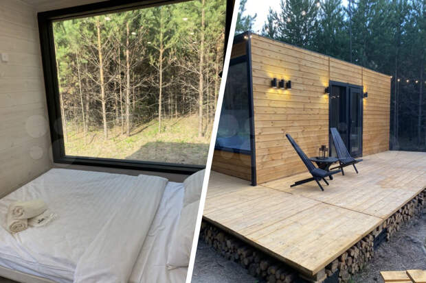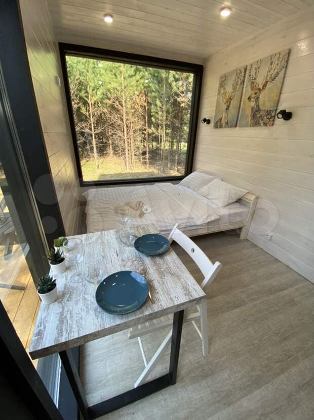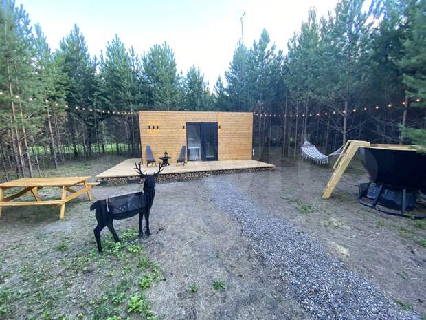 Этот домик на 100 сотках земли хоть и выглядит скромным, но вид из окна открывается на сосны. Он размером со студию в многоквартирном доме — 20 квадратов. На этом пространстве можно найти спальню и маленькую кухоньку. Украшает всё мебель в скандинавском стиле, традиционный олень и гирлянды, придающие уют любому вечеру.