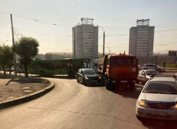 Красноярцы пишут, что ДТП устроил водитель КАМАЗа, который столкнулся с легковой машиной. Авария случилась в среднем ряду на кольце Предмостной площади.