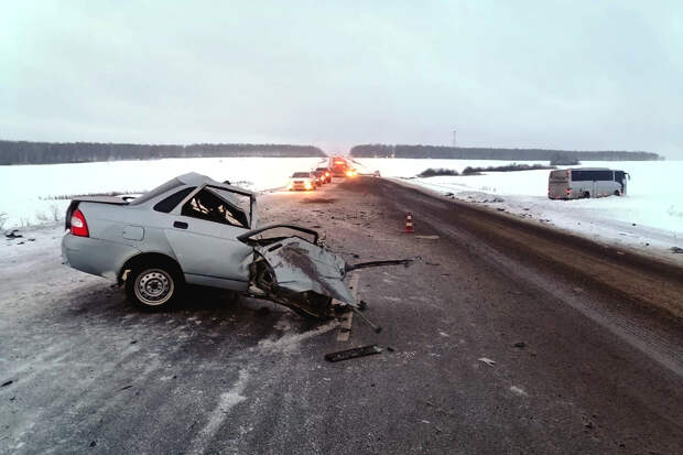 «Приору» разорвало пополам от удара о пассажирский автобус Кодинск — Красноярск