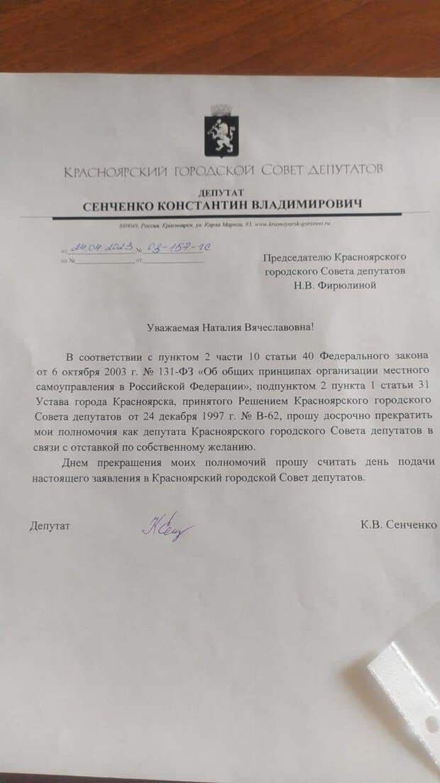 Депутат горсовета Красноярска Константин Сенченко 24 апреля сообщил, что досрочно снимает с себя полномочия.
