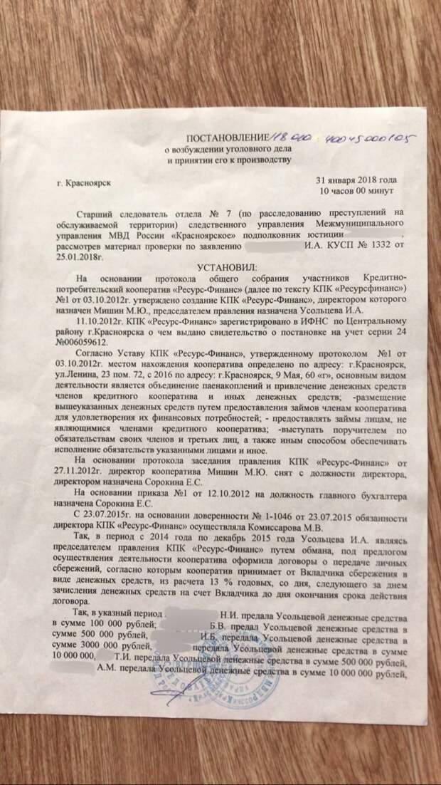 В январе 2018 года по заявлению многочисленных потерпевших в полиции Красноярска возбудили уголовное дело по статье «мошенничество в особо крупном размере с использованием служебного положения». Следствие считает, что 61-летняя Ирина Усольцева, будучи председателем правления КПК обманывала людей и отнимала их деньги под предлогом вложения под проценты.
