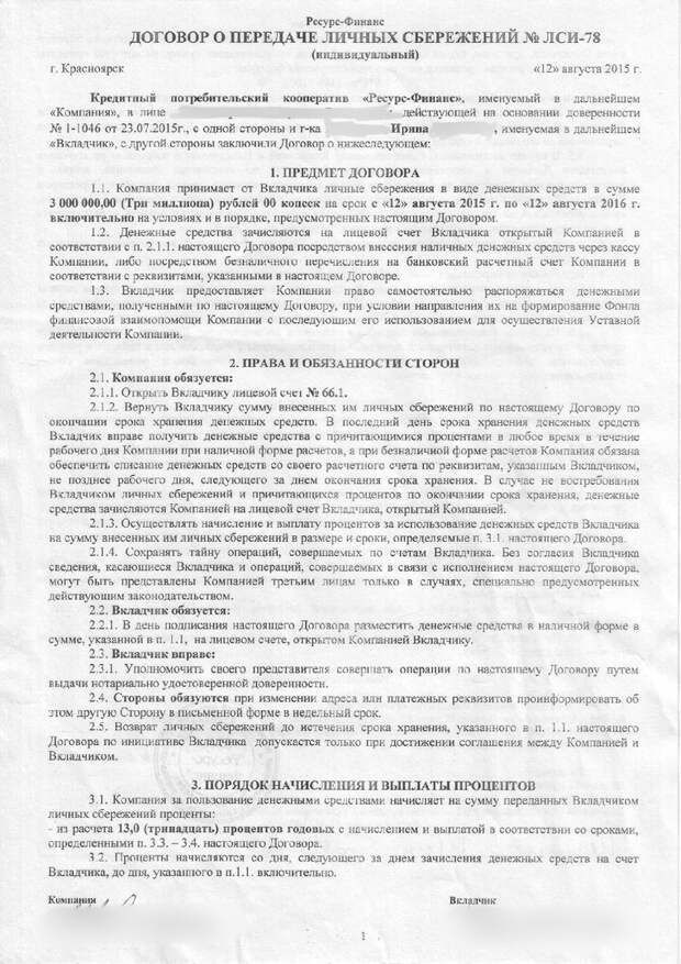 Договор заключили в 2015 году. Согласно документу, Ирина вложила в кооператив три миллиона рублей на год. Договор предусматривает возврат вложенных средств с процентами — 13% годовых по окончании срока. До сих пор Ирина не получила никаких денег. Сейчас и кооператив, и сама Усольцева числятся банкротами.