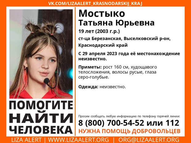 Поехать в Краснодарский край на поиски возможности пока нет.— Давно [ее] видел, она в Краснодарском крае же живет. Года 4 назад, наверное, переехала. Через телеграм как бы общаемся. Даже, честно, вообще не знаю, знаю то же самое, что и вы. То, что вы читали в новостях, я то же самое читал. Хотелось бы на поиски, только не получается уехать. Она моя племянница, то есть брата моего дочь, — рассказывает дядя пропавшей Игорь Мостыко.