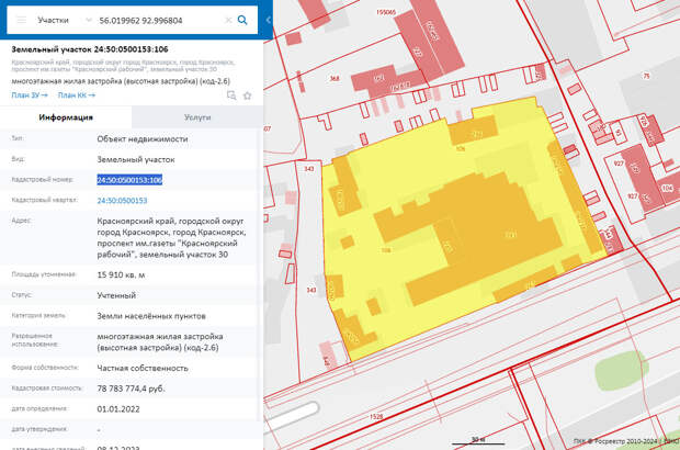 Как видно из документов аукциона, в 2022 году земля имела вид разрешенного использования «размещение промышленных, коммунальных и складских объектов IV-V классов вредности». Но сейчас, судя по карте Росреестра, этот участок имеет вид разрешенного использования «многоэтажная жилая застройка».