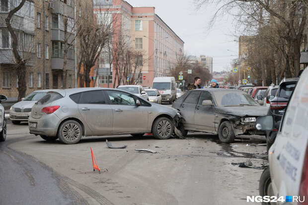 Там же находятся и журналисты NGS24.RU. По предположению наших коллег, виновником ДТП мог стать Opel Astra. Автомобиль выезжал со двора и при повороте столкнулся с Lada — оба автомобили зацепили припаркованный Geely. В это трио врезался Subaru, пятым стал Volkswagen.