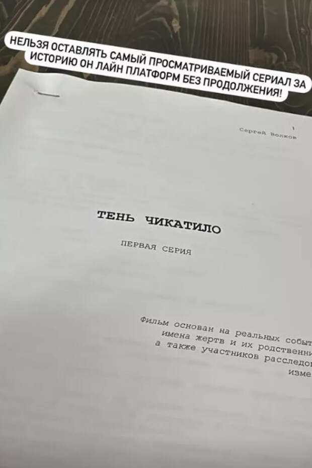 Информацию о старте съемок режиссер разместил в своих соцсетях, опубликовав снимок сценария, который пишет Сергей Волков — он же писал сценарий и нашумевшего сериала «Чикатило» с Дмитрием Нагиевым, два сезона которого выходили с 2021 по 2022 год.