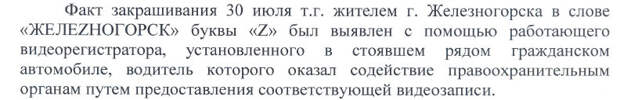 30 июля в Железногорске произошла такая история: 40-летний местный житель, отец детей 3 и 8 лет, торговый представитель в небольшой фирме Роман Балясин закрасил букву Z в надписи с названием города. Его тут же жестко задержали. За порчу буквы суд его уже оштрафовал на 40 тысяч рублей по статье 20.3.
