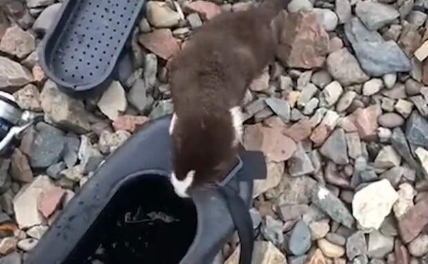 На записи видно, как животное хватает кинутую в кан рыбу, переворачивая последний, и убегает в лес, но потом возвращается, видимо, за добавкой и уже пытается открыть закрытый котелок. В целях безопасности зверька мы не публикуем место его встречи с людьми.