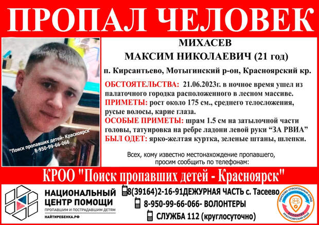 Всем, кто обладает какой-либо информацией об обстоятельствах исчезновения разыскиваемого и его возможном местонахождении, просьба сообщить по телефону (391) 227-06-45 или 112.