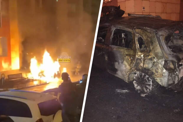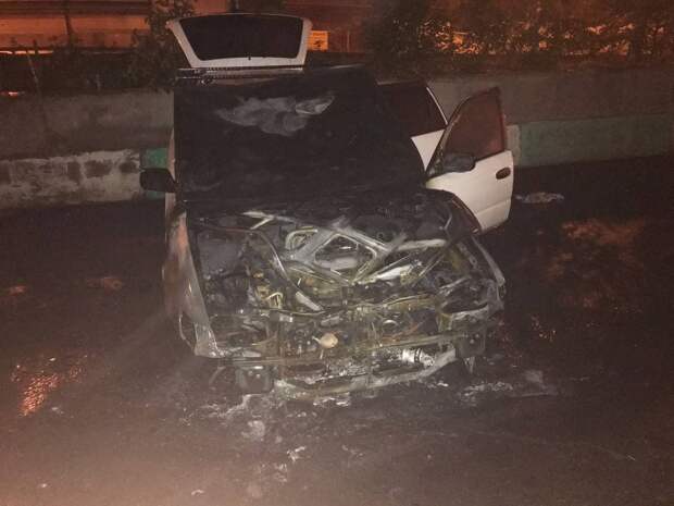 В результате пожара одна машина выгорела полностью, вторая частично. Незначительно пострадали еще два автомобиля, припаркованные неподалеку — Renault и Kia