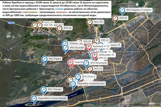 Отключение также коснется Железнодорожного района — без воды останутся все жители до железной дороги со стороны Октябрьского района, улицы Озерная, Северо-Енисейская и Маерчака от Красной Гвардии в сторону ул. Калинина. Холодной воды не будет и в части Центрального района. Подачу приостановят в поселке СВЭМ, на улицах 2-я Брянская и Брянская (от Калинина в сторону поселка Солонцы), дома на улицах Подзолкова, 3а, 3б, 3в, 3и, 3к, 5, 5а, 5б, 5в, 17, 21, Промысловая, Караульная, 1–37 и улице Бадалык.Без воды останется один дом в Советском районе — это переулок Светлогорский, 10б. Отключение коснется и жителей пригорода. Холодной воды не будет в поселках Солонцы и Шамони, в микрорайонах Новалэнд и Живём, деревнях Минино и Бугачево. Отключат холодную воду с 23:00 11 августа до 23:00 13 августа.