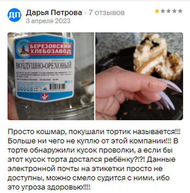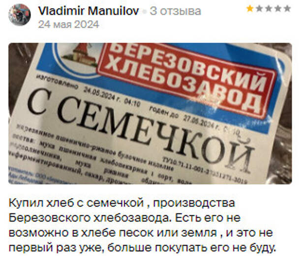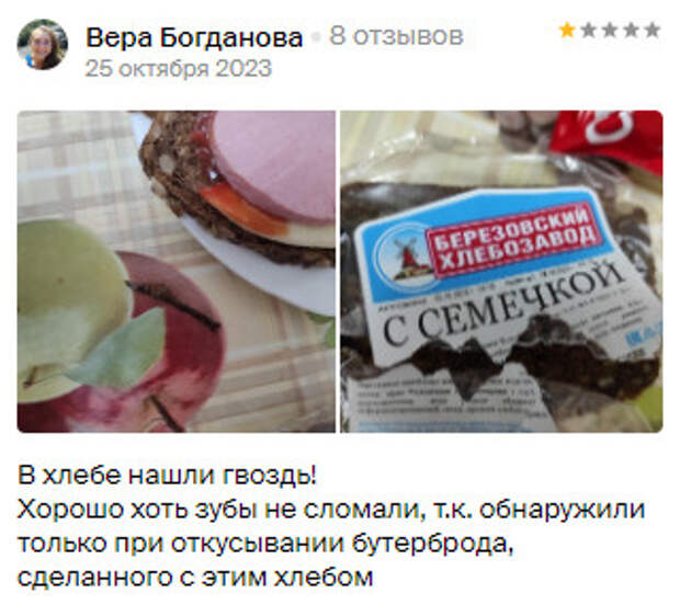 На 2gis.ru мы нашли много отрицательных отзывов про продукцию «Березовского хлебозавода». Похоже, люди неоднократно находили лишние «добавки» в мучных изделиях.