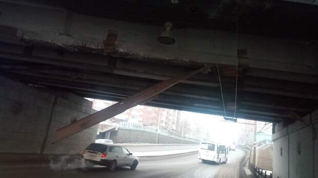 С ж/д моста на Свободном оторвалась балка и нависла над дорогой. Движение частично перекрыто
