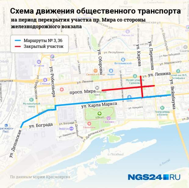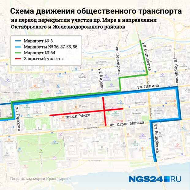 автобусы № 3, 36, 37, 55 и 56 с Коммунального моста поедут по Карла Маркса, затем по Сурикова с выездом на Ленина и далее по обычным схемам движения;