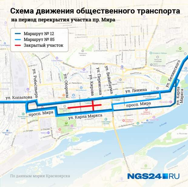 автобусы № 12, 85 поедут по улице Ленина без заезда на проспект Мира;