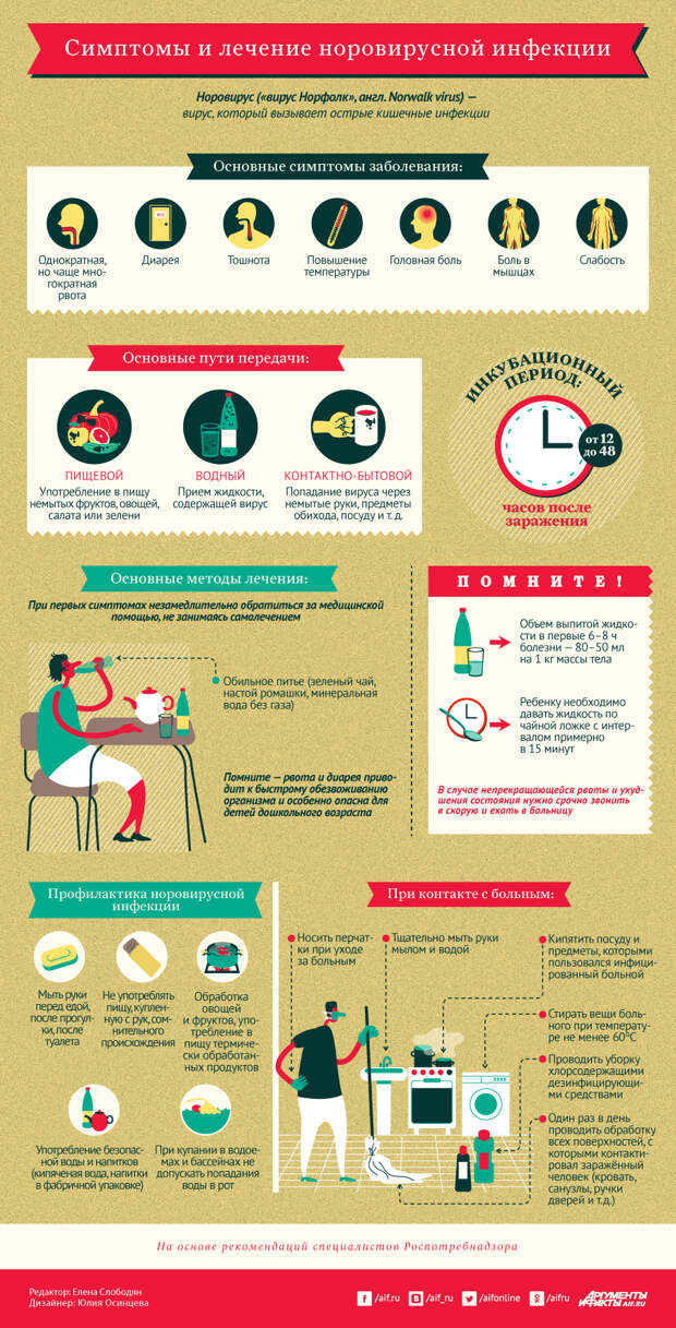 Как правило, инкубационный период болезни составляет 12–48 часов, продолжительность заболевания — от 2 до 5 дней.