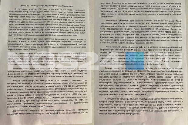 — По факту опубликованного в СМИ анонимного письма сотрудников краевой офтальмологической больницы принято решение организовать собрание коллектива для открытого обсуждения и разрешения сложившейся ситуации.