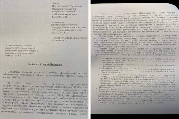 — С момента выкупа земли, руководитель Наймушин А.А. начал регулярно превышать свои должностные полномочия, не исполнять устав, заниматься самоуправством с применением насилия. Вместо исполнения уставных целей, он активно развивает личный бизнес, катает людей по Красноярскому морю [...]. За годы [пребывания на] руководящей должности ДФПС Наймушин А.А.: обвинялся в жестоком обращении с детьми, их избиении, будучи тренером в СДЮСШОР «Юность», повлекшем за собой лишение его тренерской должности, — говорится, в частности, в обращении.
