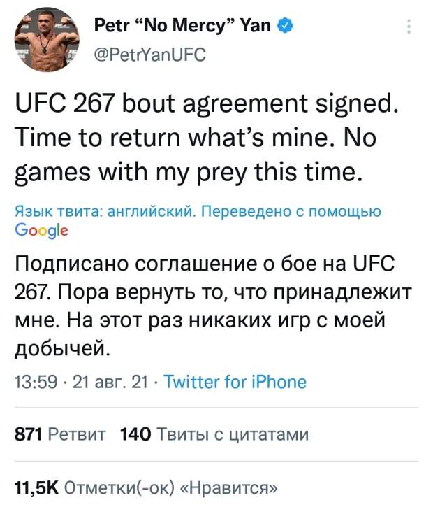 Известный боец смешанного стиля, уроженец Дудинки Пётр Ян объявил дату боя-реванша с американцем Алджамейном Стерлингом. Бой состоится 30 октября в Абу-Даби в рамках турнира UFC 267.