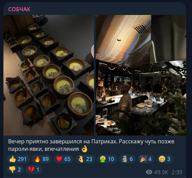 В ресторане уже побывала журналистка Ксения Собчак вместе с мужем — театральный режиссером Константином Богомоловым. О своем визите Собчак сообщила в своем телеграм-канале. Там же она пообещала развернутый отзыв.