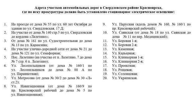 В Свердловском районе Красноярска должно появиться освещение на 20 улицах в течение года. Мэрию через суд обязали сделать его.