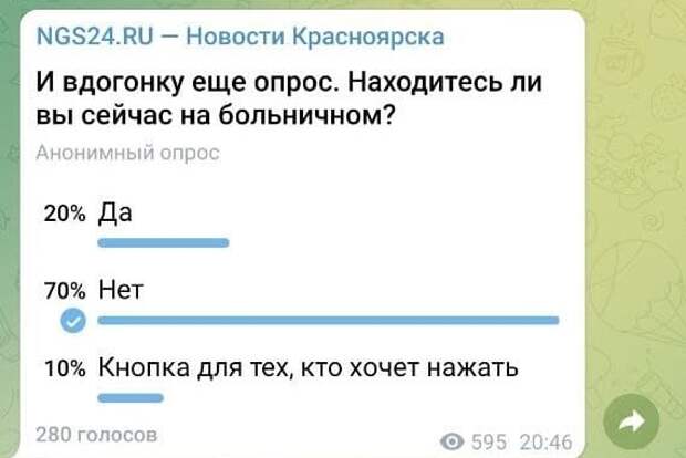 В телеграм-канале «NGS24.RU — Новости Красноярска» и в нашем Instagram со вчерашнего вечера проводился опрос горожан, болеют они сейчас или нет. Суммарно нам ответили 1766 красноярцев, из них 383 человека сидят на больничном, 1365 — работают и не привязаны к дому.