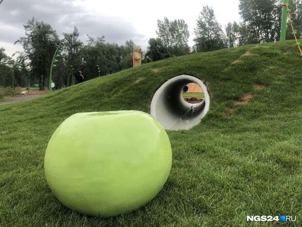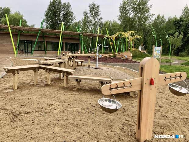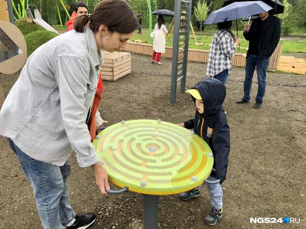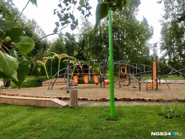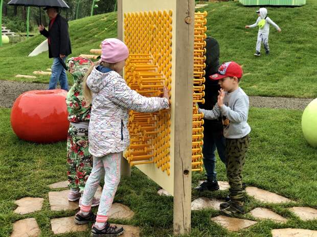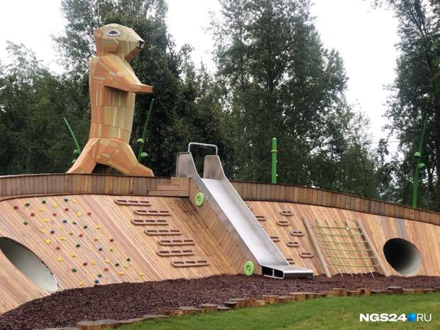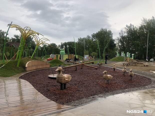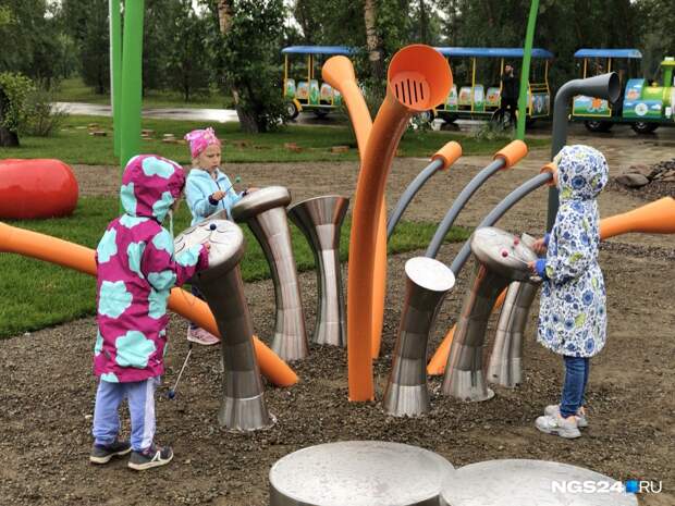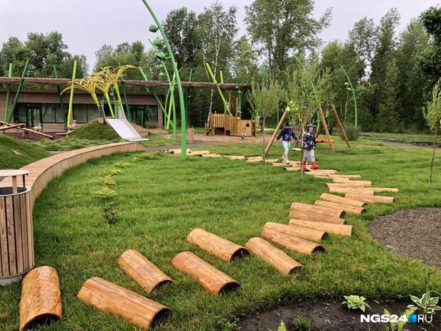 Малые формы, то есть все игровые локации и фигуры, выполняли две другие организации — «Артстиль» и «КГ-Групп».Здесь, например, появился музыкальный городок, где дети могут стучать специальными палочками по инструментам, которые издают звук, похожий на мелодию ханга или глюкофона. Установлен веревочный городок, фигура, имитирующая реальный скелет животного, найденный в Шарыповском районе.