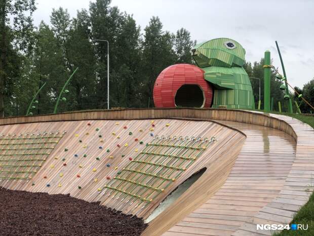 В четверг, 7 июля, на острове Татышев журналистам презентовали новую детскую площадку. Она находится за вантовым мостом слева — пройти мимо невозможно. Новый объект занимает большую площадь — 8 тысяч 960 квадратных метров. Половину застроили новыми игровыми элементами для детей разных возрастов, вторую часть отдали под озеленение.