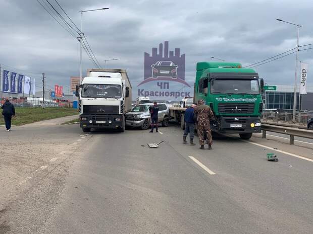 В Красноярске серьезные затруднения на проспекте Котельникова — там произошло столкновение двух фур с внедорожником. Автомобили заняли все три полосы для движения в сторону Красноярска. Две фуры МАЗ там зажали между собой Toyota Land Cruiser Prado.