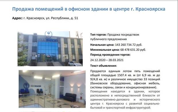 Сейчас «Российский аукционный дом» распродает с торгов несколько помещений банка. Объявления размещены на сайте организации. Например, сразу одним лотом выставлены пять помещений в здании на Республики, 51. Их общая площадь — 1507 квадратов (от 6,9 м2 до 924,8 м2). По сути, это все площади, которые занимал банк в пристройке «Офсета». Начальная цена — 143 миллиона рублей. В эту же сумму входят различные предметы — банковское оборудование, офисная мебель, системы охраны, связи, кондиционеры.
