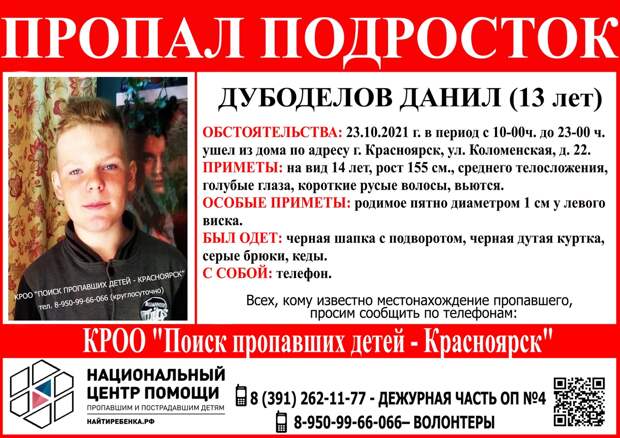 Всем, кому что-либо известно о местонахождении подростка, просьба сообщить в полицию 8 (391) 262–11–77 или волонтерам +7 950 99–66–066.