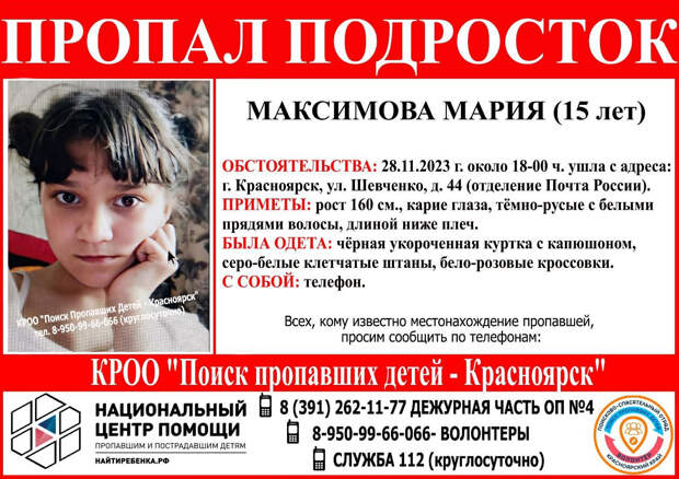 В Красноярске ищут 15-летнюю Марию Максимову. Вечером 28 ноября она вышла с отделения «Почта России» на улице Шевченко, 44, с тех пор о ней ничего неизвестно. Жителей города просят помочь в поисках ребенка.