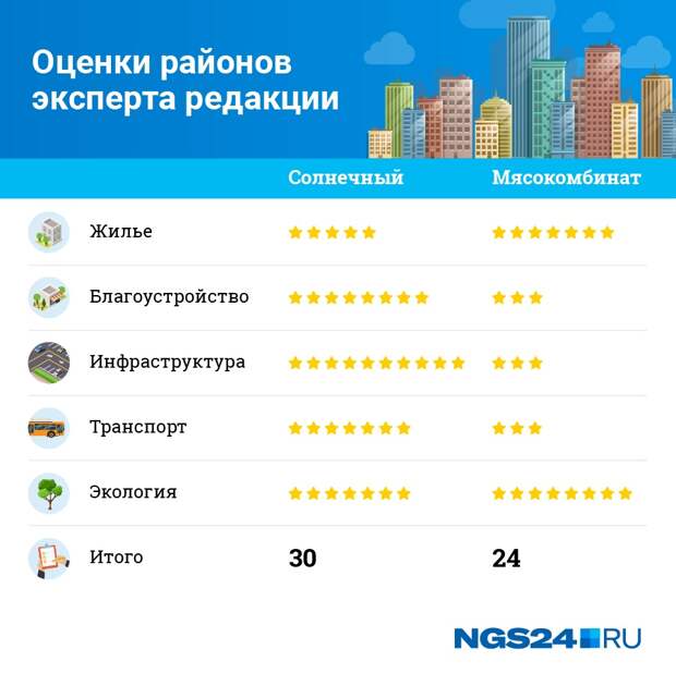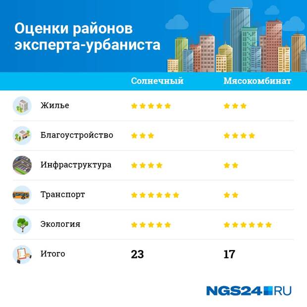 За инфраструктуру Солнечному достается максимальная отметка — 10 баллов, Мясокомбинату — 3.