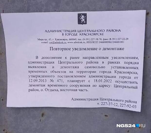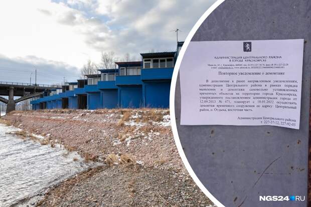 На объектах лодочной станции «Отдых» появились уведомления о демонтаже построек. Как рассказала NGS24.RU руководитель станции Русана Карпова, распечатанные уведомления наклеили почти на каждый объект, включая большие эллинги синего цвета. Их и другие объекты на станции сочли «самовольно установленными временными объектами».