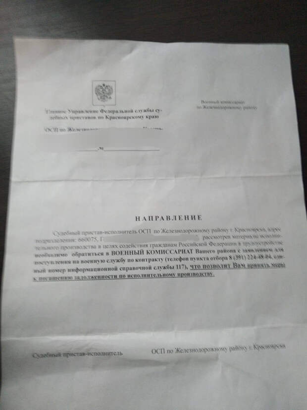 27 октября Ольга вышла с работы и увидела под ветровиком машины письмо. Там была повестка о вызове на прием к судебному приставу, а также направление, в котором было написано, что Ольге «необходимо обратиться в военный комиссариат Вашего района с заявлением о поступлении на военную службу по контракту <...>, что позволит Вам принять меры к погашению задолженности по исполнительному производству».