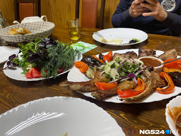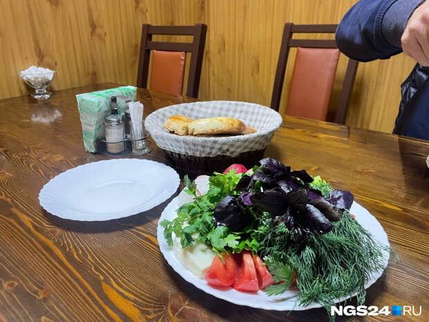 Спустя 20 минут дождались того, ради чего приехали. К шашлыку подают теплую лепешку и свежие овощи с зеленью — помидоры, огурцы (они, кстати, почищены от шкурки), редиску и сыр. Мясо выложили на тарелку и принесли вместе с овощами гриль.