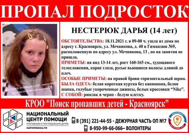 Полиция и волонтеры Красноярска разыскивают 14-летнюю Дарью Нестерюк, которая ушла утром в школу и до сих пор не вернулась. В ведомстве рассказали, что школьница ушла на учебу в 9 утра из дома на Мечникова,40 и до настоящего времени не вернулась. В школе девочка не появлялась.