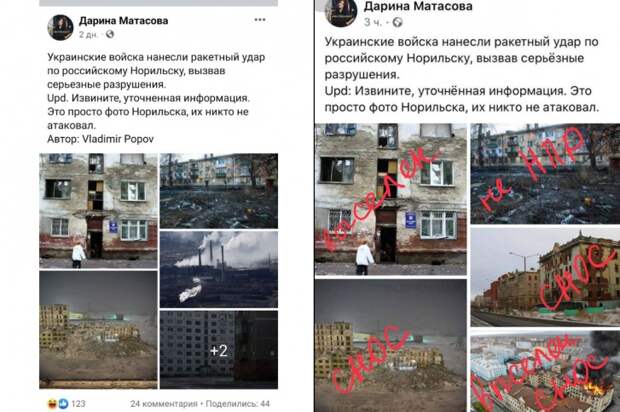 А норильчан обидела фотограф из Киева. Она распространила фото полуразрушенных зданий, уверяя, что это Норильск. Пост опубликовал телеграм-канал «Жить в Норильске», он вызвал бурное обсуждение — читатели оставили свыше 170 комментариев. Не во всех фотографиях жители узнали свой город. Судя по комментариям местных, одно изображение к Норильску отношения не имеет, это третье по счету фото. Норильчане обратили внимание на деревья и пояснили, что у них не растут деревья. На всех остальных изображены здания под снос.