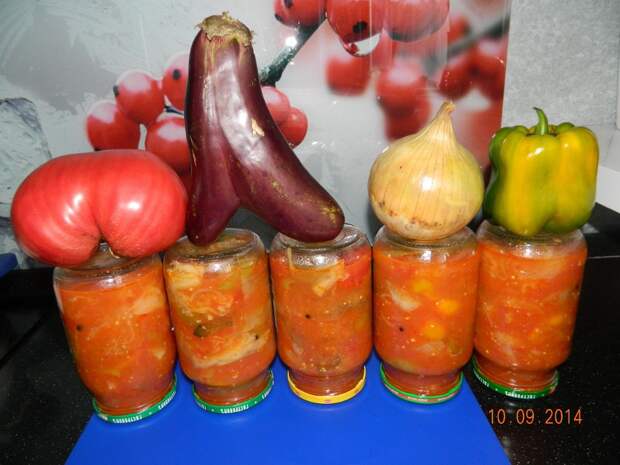 Баклажаны — 10 шт.;Репчатый лук — 10 шт.;Помидоры — 10 шт.;Сладкий перец — 10 шт.;Вода — 2 стакана;Сахар — 5 ст. л.;Уксус — 1 стакан (9%);Растительное масло — 1 стакан;Соль — 2 ст. л.