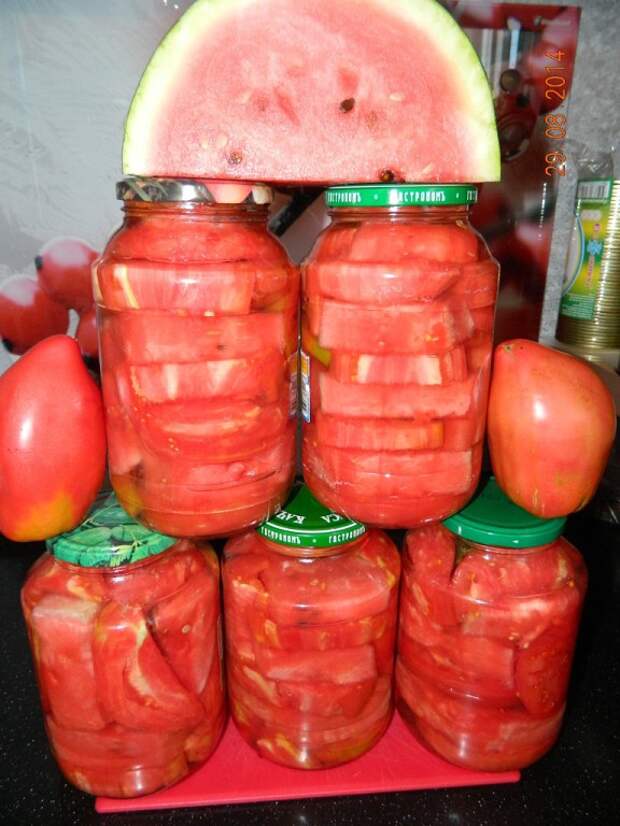 В 3-литровые чистые, стерилизованные банки нужно уложить рядами помидоры и арбуз. С арбузов снять корку и по возможности удалить семена.