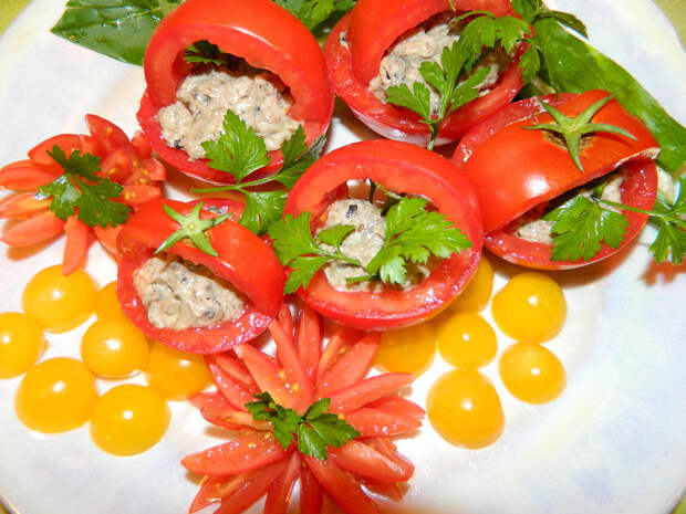Из красных томатов вырезаем корзинки и закладываем в них приготовленную икру. Закуска готова!