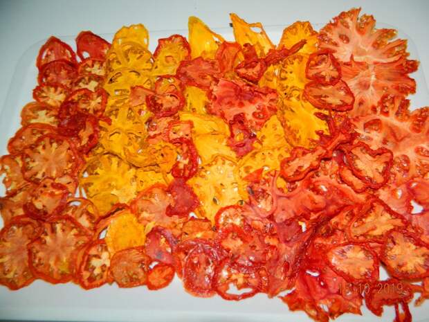 Через 12 часов сушки проверьте чипсы. Если плоды не сильно сочные, то томаты заметно подвялятся к этому времени. Сигналом готовности помидоров будет заметное уменьшение в объеме и легкость. При складывании или нажатии на чипсы, не должна выделяться влага.