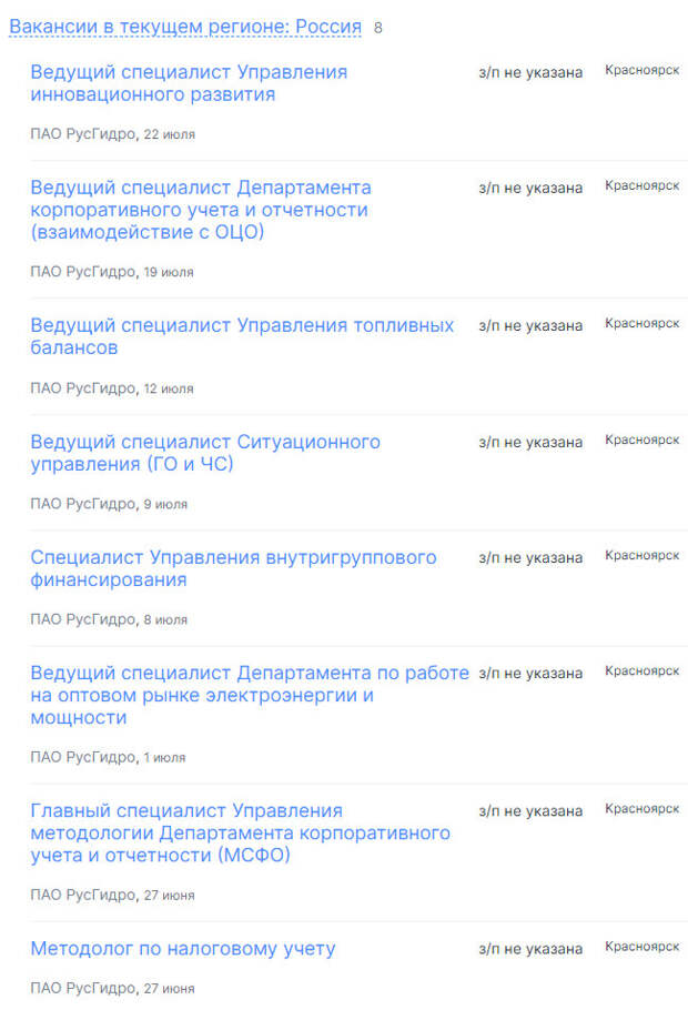 На портале по поиску работы hh.ru мы нашли ряд вакансий «РусГидро», все в Красноярске.