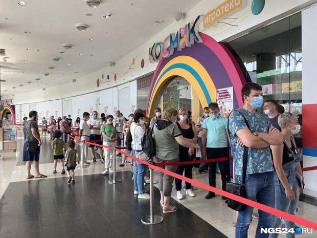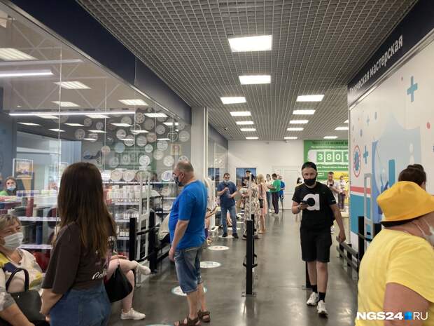 В обед среды, 14 июля, мы также застали очередь в пункт вакцинации в ТЦ. Красноярцы приходят сюда заранее, еще до открытия магазина, и ждут по несколько часов своей прививки.