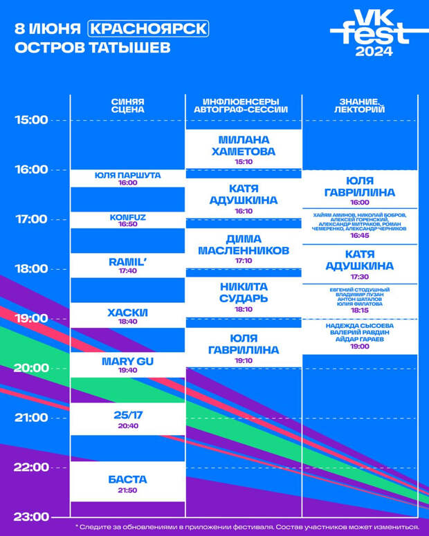 В зоне инфлюенсеров можно будет получить автографы у певиц и звезд сети Юлии Гаврилиной, Кати Адушкиной, Миланы Хаметовой, стримера Никиты Сударя. На площадке для лекториев можно будет также встретиться с инфлюенсерами, красноярскими бренд-шефами, гендиректором Красноярской краевой филармонии Евгением Стодушным, и. о. ректора Сибирского государственного института искусств имени Дмитрия Хворостовского, доктором культурологии Владимиром Лузаном, управляющим партнёром ООО «Проектдевелопмент», членом Союза архитекторов России, член экспертного совета АНО «Институт города» Антоном Шаталовым, замруководителя администрации губернатора Красноярского края Юлией Филатовой, а также актрисой Надеждой Сысоевой, комиком Валерием Равдиным, актёром и певцом Айдаром Гараевым.