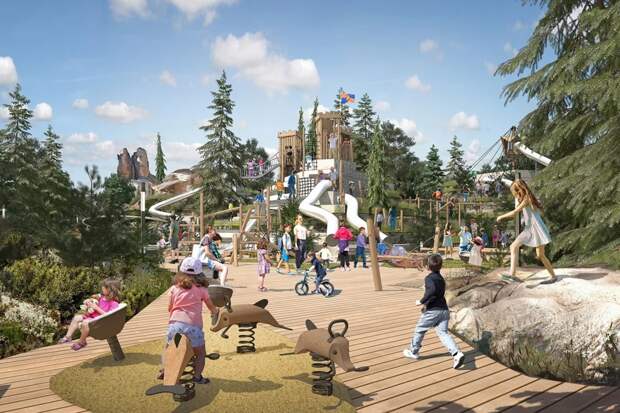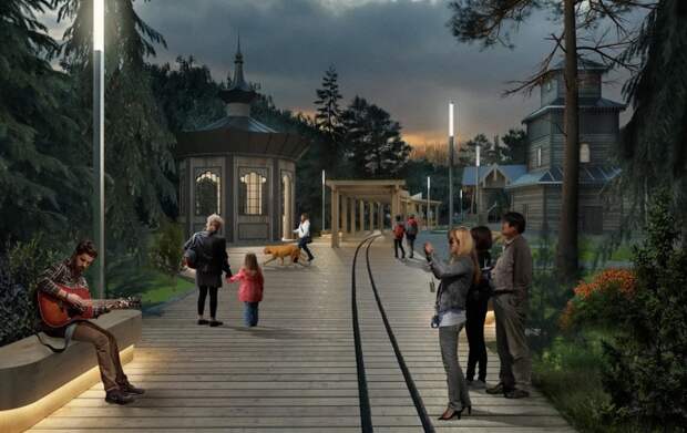 Архитекторы предложили обновить железную дорогу, которая свяжет площадки для игр подростков, детскую крепость, летний кинотеатр, медиацентр, каток и летнюю лужайку.