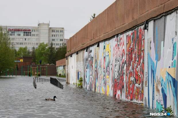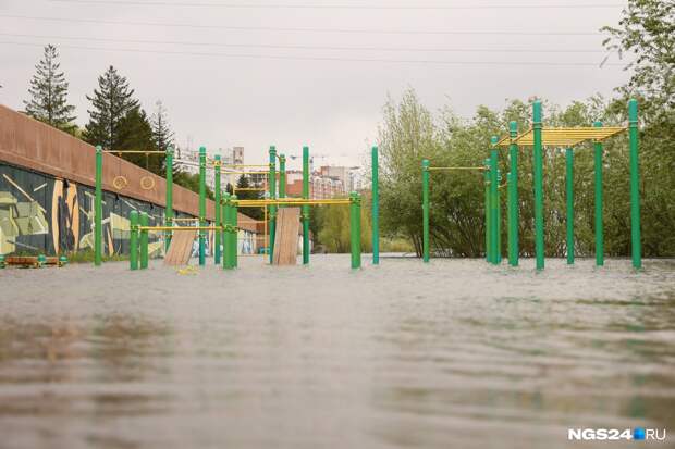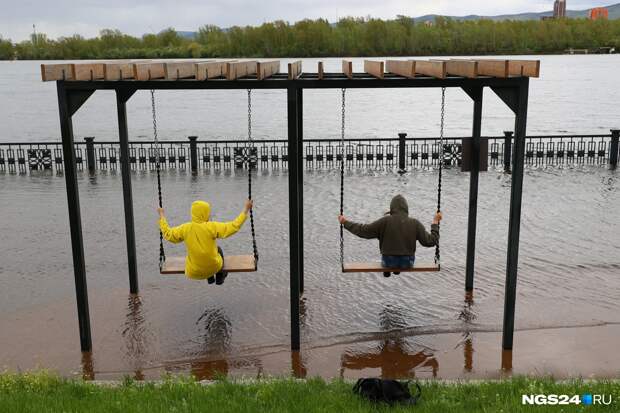 Левобережная набережная снова в воде. Затоплен участок в районе КИЦа и спортивная площадка напротив Центрального парка. Вода в Енисее поднялась из-за сбросов на Красноярской ГЭС.