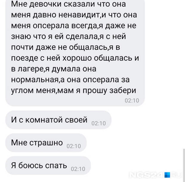 В редакцию NGS24.RU обратилась мама 13-летней школьницы из города Шарыпово Мария М. Она говорит, что в детском лагере дети травили ее дочь, произошла драка. Девочка звонила и писала ночью, умоляя ее забрать с отдыха. Родители так и поступили, а врачи зафиксировали побои. Что по этому поводу говорят в Минобре края и прокуратуре — читайте ниже.