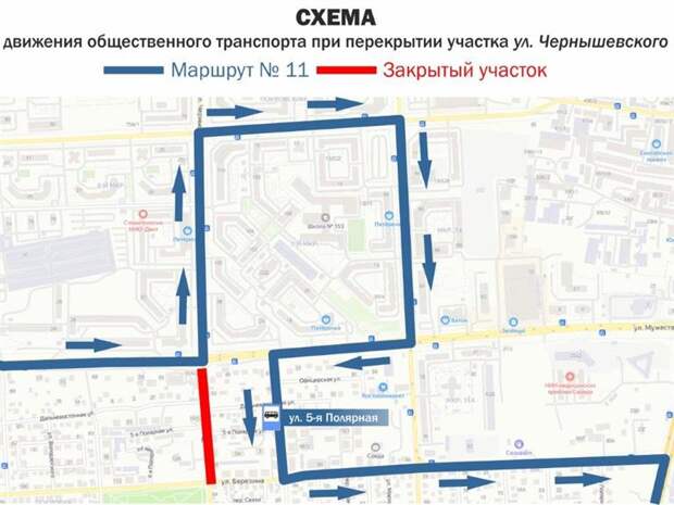 С 5 июля в связи с проведением работ по строительству тепловых сетей на Чернышевского изменится схема движения автобусного маршрута № 11 по направлению в центр города: автобусы будут объезжать закрытый участок по ул. Фурманова. На ней будет обустроена временная остановка «Ул. 5-я Полярная». В обратном направлении схема движения автобусов не изменится.